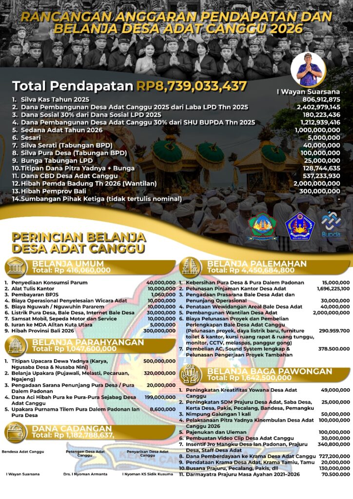 Parum Tutup Buku Warsa 2025 Desa Adat Canggu telah terlaksana dengan baik dan lancar pada tanggal 14 Februari 2026 yang bertempat di Bale Desa Adat Canggu. Kegiatan ini dihadiri oleh para prejuru Desa Adat Canggu sebagai bagian dari tanggung jawab bersama dalam melakukan evaluasi menyeluruh terhadap pelaksanaan program kerja selama satu tahun terakhir, sekaligus sebagai wadah untuk menyelaraskan langkah strategis dalam mendukung keberlanjutan program adat di tahun-tahun mendatang.